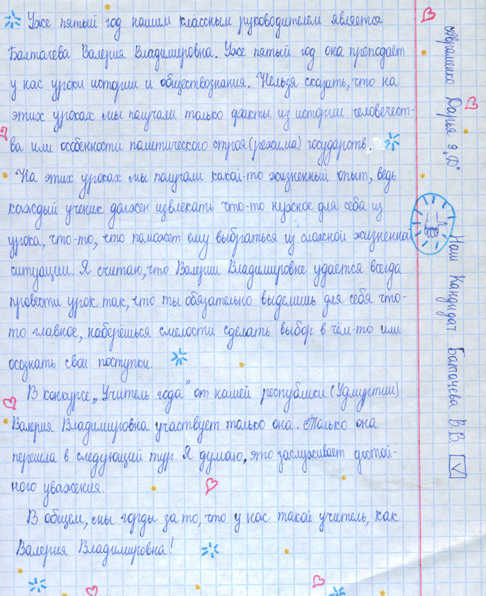 "Мы очень рады и счастливы, что Валерия Владимировна участвовала в таком ответственном и сложном конкурсе. Валерия Владимировна - великолепный учитель! Ее уроки всегда интересные и увлекательные. Она всегда учит своих учеников саморазвитию и справедливости. Валерия Владимировна всегда объективна. Мы очень рады что она наш учитель!" - Шарафиева Лейсян, 9А.