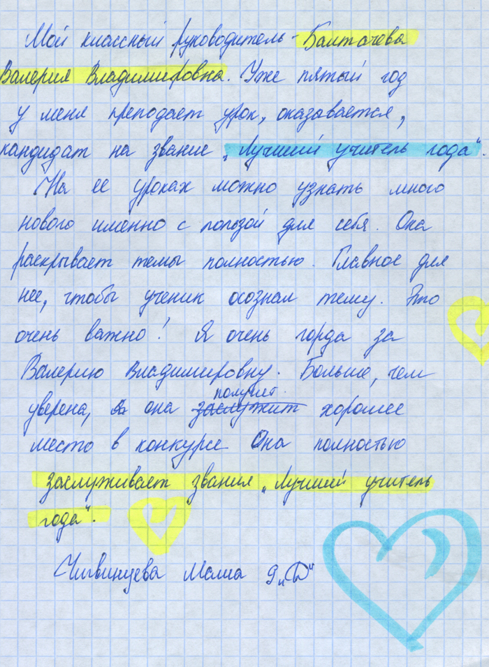 "Валерия Владимировна - хороший учитель и классный руководитель. Ее уроки очень интересные и познавательные. С ней можно поговорить на любые темы. Валерия Владимировна справедливый и добрый учитель. Она достойна звания Лучший учитель и об этом знает вся наша школа!" - Богатырева Дарья, 9Д.