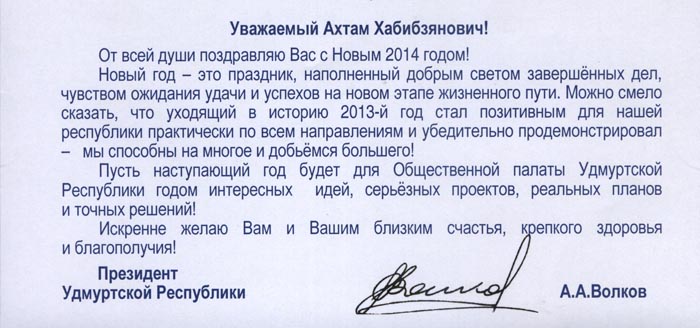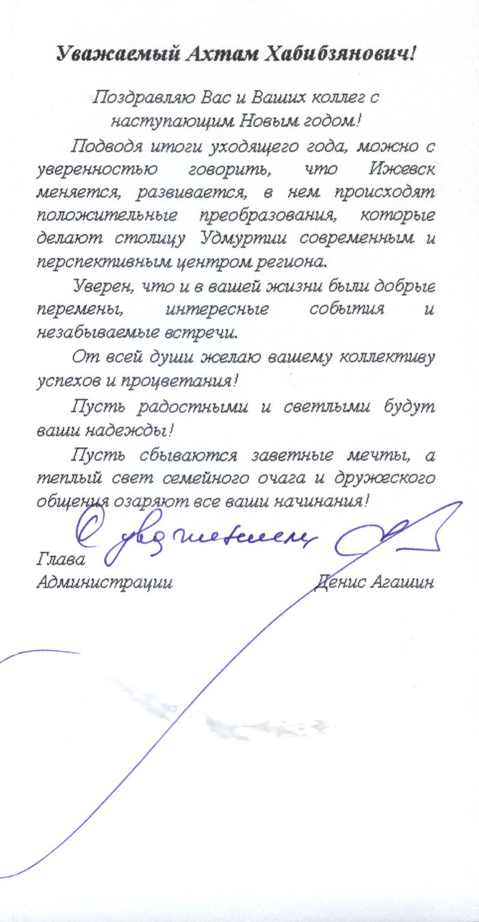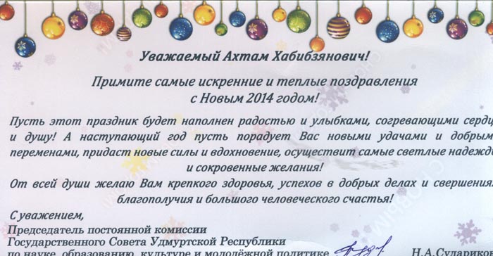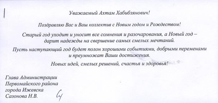 Поздравления с Новым годом наша школа получила от Президента Удмуртской Республики А.А.Волкова, Главы Администрации Д.В.Агашина, Главы Администрации Первомайского района Н.В.Сазоновой, Главы города Ижевска А.А.Ушакова и Команды Сколково.