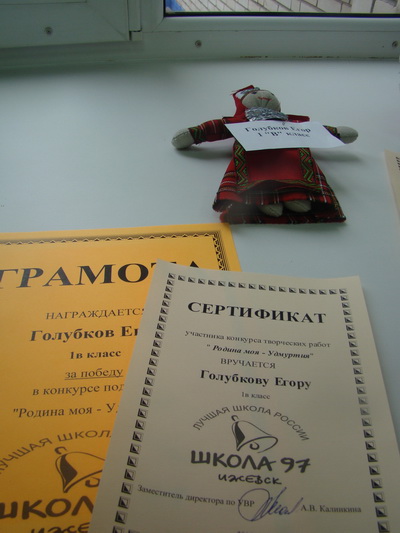 Что нужно знать о коррупции НовостиКонкурс «Родина моя - Удмуртия»В нашей школе прошел конкурс «Родина моя - Удмуртия». Ребята 1в класса тоже приняли в нем участие. Мы выполняли работы в разном стиле и из разных материалов: из ткани и бумаги, из риса и глины, выжигали по дереву. Спасибо нашим мамам и папам за помощь, работы получились красивыми и интересными. Мы получили не только сертификаты, но были отмечены грамотами. Конкурс получился как продолжение занятий по краеведению. Мы знакомились с улицами нашего города, с памятниками, с историей, посетили мастер-класс по изготовлению кукол у Степановой Надежды Леонидовны в студии «Мугур», сходили на концерт в музыкальную школу №2, где слушали песни на удмуртском языке. Нам нравится узнавать новое и самим выполнять работы!