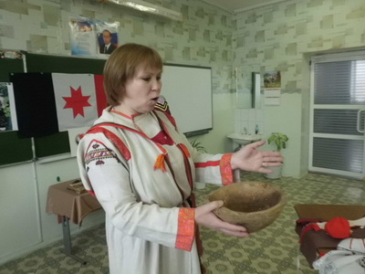 «Сказка в национальном костюме»Сегодня ученики 1а класса посетили музейный урок образовательного центра «Краевед» по теме: «Сказка в национальном костюме». Увлекательный рассказ о костюмах удмуртов рассказала первоклассникам Булдакова Марина Вольтовна. Дети воочию увидели разницу в костюмах южных и северных удмуртов. Узнали, что в костюме северных удмуртов присутствуют элементы русского народа, а в костюмах южных удмуртов есть нотки татарского. Девочки побывали в образе удмуртских невест, надев на себя свадебный фартук и головной убор. Носить на голове его было непросто, достигал он в высоту 70 см и весил порой около 3 – 4 кг. Невесте на свадьбе нельзя было ронять головной убор, иначе жених мог отказаться от неё. Теперь ученики знают, как отличить замужнюю женщину удмуртов от девушки, которая ещё не вышла замуж. Время урока пролетело незаметно. Будем ждать новых встреч с Мариной Вольтовной.