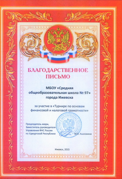 Результаты турнира по основам финансовой и налоговой грамотностиВ мае состоялся финал конкурса «Турнир по основам финансовой и налоговой грамотности», проводимого Управлением ФНС России по Удмуртской Республике. В нем приняли участие ученики 11-х классов со всей республики. Всего же в конкурсе участвовало 260 человек. В финал прошли 17 человек из них 8 ученики наши школы. По итогам конкурса - второе место занял ученик 11к класса Князев Денис, третье место досталось ученику 11а класса Жданову Владу. Все призеры получили грамоты, а также целевое направление на факультет экономики в УдГУ. Благодарственное письмо от заместителя министра по физической культуре, спорту и молодежной политике Удмуртской Республики М.Г. Сорокина, получила заместитель директора Королева Мария Николаевна. Поздравляем ребят с победой.