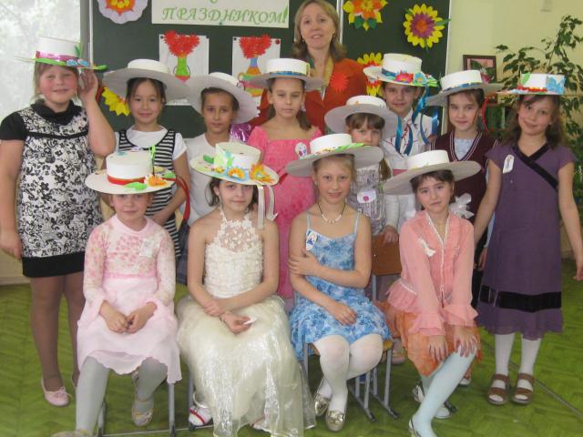 Прекрасные девочки из 2Л в очаровательных шляпках. Эти шляпки им подарили мальчики из нашего класса в честь Международного женского дня 8 марта. 5 марта в классе был праздник «Если я бы был девчонкой…». На праздники девочки продемонстрировали свои умения делать экстравагантные причёски, грациозно управлялись с высокими каблуками, демонстрировали изысканные модели праздничных нарядов, исполнительское мастерство эстрадных песен. Мальчишки вручили им свои подарки, которые изготовить им помогла Елена Васильевна на занятиях студии «Золотое сечение». Восторгам девчонок не было конца. С праздником, девочки!