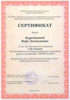Министерство образования и науки Удмуртской Республики, Институт повышения квалификации и переподготовки работников образования Удмуртской Республики с 15 по 26 февраля 2010 года проводили Республиканский конкурс элективных курсов. Данный конкурс, который уже стал ежегодным, рассматривает лучшие образцы научно-педагогических проектов в таких номинациях, как ориентационные курсы, технология, филология (русский язык и литература, иностранный язык, удмуртский язык и литература), математика, естествознание (биология, экология, география, химия), ОБЖ и физическая культура, информатика, история и обществознание (мировая художественная культура, экономика и право). В конкурсе приняла участие Курочкина Вера Леонидовна - руководитель структурного подразделения (начальник отдела делопроизводства), учитель технологии. По результатам конкурса Вере Леонидовне был выдан сертификат в том, что она является лауреатом I-ом степени Республиканского конкурса элективных курсов в номинации «Технология».