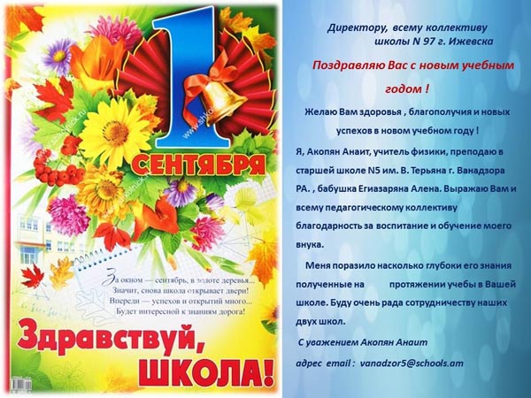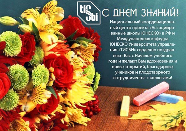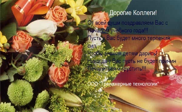 Поздравляем вас с Первым днем нового учебного года. Этот день знаменуется новыми начинаниями, устремлениями и перспективами. Пусть новый учебный год будет для вас счастливым, пусть исполнятся мечты и сбудутся надежды. Пусть ваши творческие замыслы и планы найдут свои воплощения.